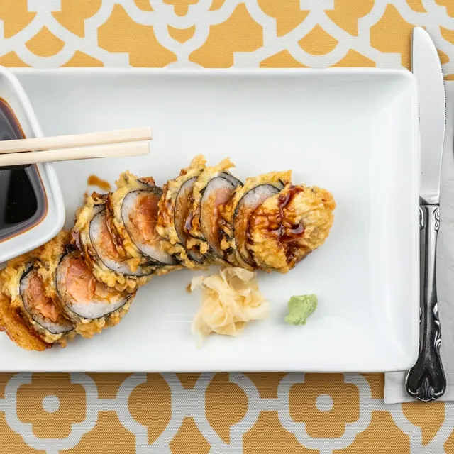 tuna, salmon, cream cheese, deep-fried top w/ eel sauce