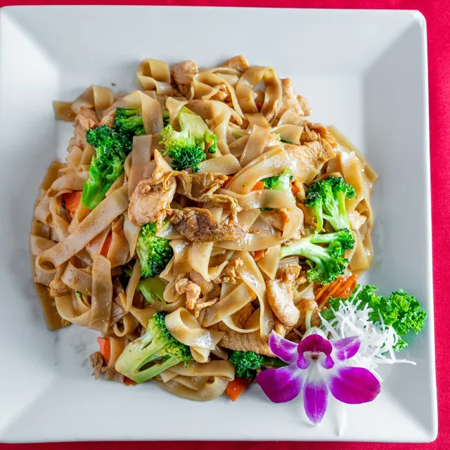 wide noodles stir-fried with eggs, broccoli, carrots, in a sweet brown sauce.