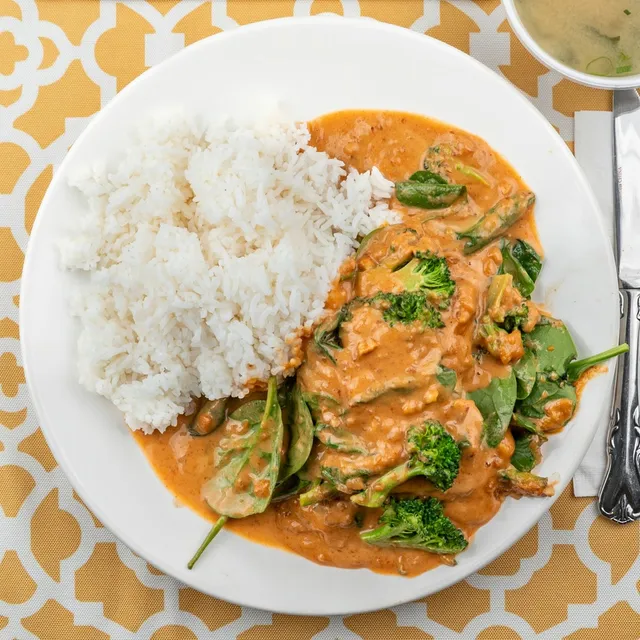 peanut curry sauce and coconut milk over a bed of steamed broccoli and spinach.